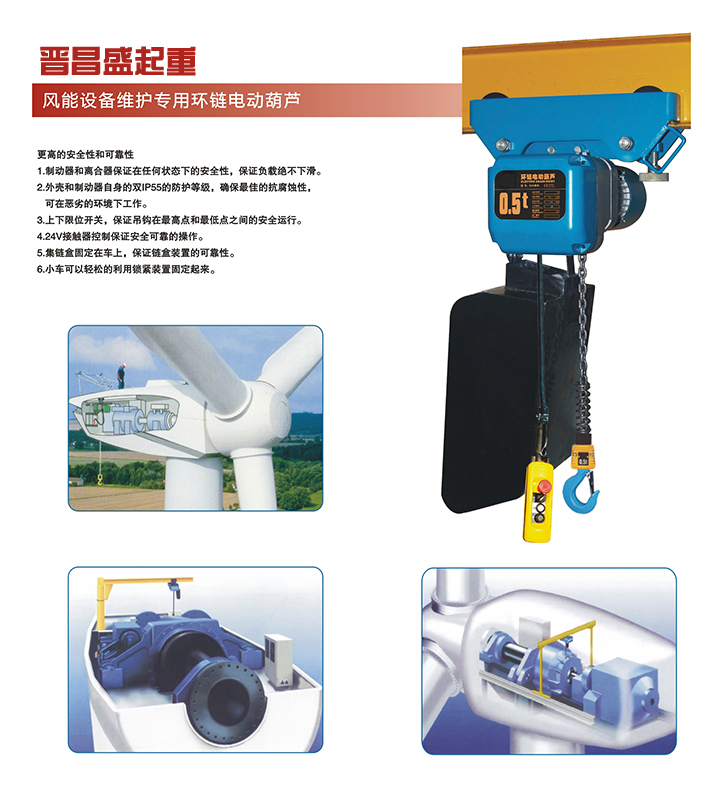 風力專用環(huán)鏈電動葫蘆作為風機機艙檢修設備,其可靠性直接影響風機應用的可持續(xù)性,根據(jù)常用風機設計結(jié)構(gòu),單軌吊或柔性梁輕型起重機在機艙檢修中得到廣泛應用,但因應用條件以及環(huán)境要求,起重機配置的電動葫蘆在一些技術(shù)細節(jié)上又有別于其他環(huán)鏈電動葫蘆。